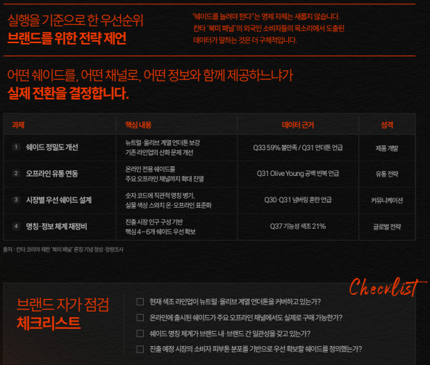보고서는 “쉐이드 전략은 제품 개발 단계에서 끝나지 않는다. 어떤 쉐이드가 어떤 채널에 얼마나 진열되는지, 온라인 상세페이지에서 실제 색상이 어떻게 전달되는지 살펴봐야 한다. 쉐이드가 존재하지만 소비자가 만날 수 없다면, 그 쉐이드는 없는 것과 같다”고 밝혔다.