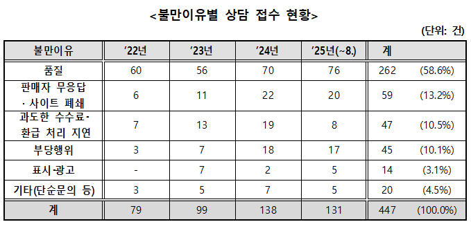 소비자의 주요 불만 이유는 △ 품질(58.6%) △ 판매자 무응답·사이트 폐쇄(13.2%) △ 과도한 수수료‧환급 처리 지연(10.5%) 등이 꼽혔다.