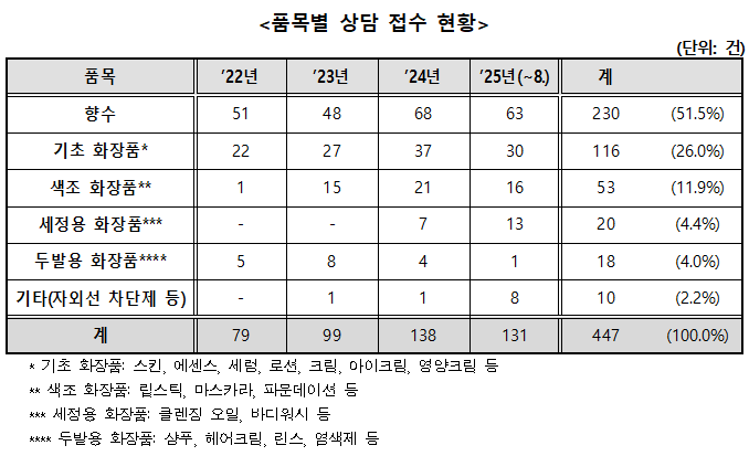 한국소비자원(원장 윤수현)이 가품 화장품 상담 실태를 발표했다. 2022년부터 올해 8월까지 최근 3년 간 가품화장품 상담 수는 447건으로 집계됐다. 1372소비자상담센터와 국제거래 소비자포털에 접수된 온라인 가품 화장품 상담은 해마다 증가하는 추세다.