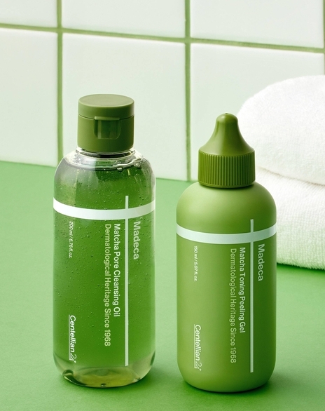‘마데카 말차 포어 클렌징 오일’은 투톤 제품이다. 병풀 오일을 함유한 투명 클렌징 오일층과 말차를 함유한 그린 클렌징 오일층으로 구성됐다.