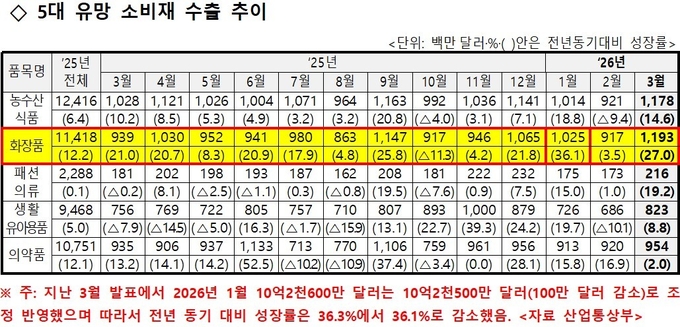 산업통상부(장관 김정관· www.motir.go.kr )가 오늘(1일) 집계 발표한 ‘2026년 3월 수출입동향’ 자료에 의하면 3월 대한민국 화장품 수출은 지난해 같은 기간(9억3천900만 달러)보다 2억5천400만 달러, 27.0%가 증가한 11억9천300만 달러를 기록한 것으로 잠정 집계됐다.