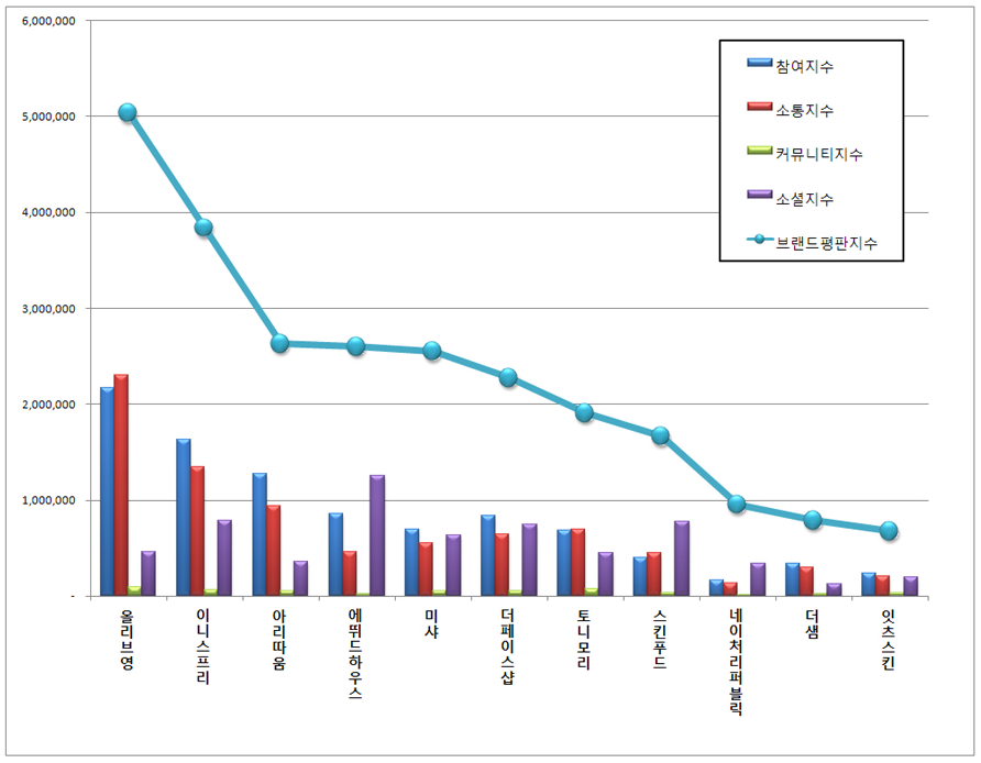 3월 화장품 전문점 브랜드평판 순위는 올리브영·이니스프리·아리따움·에뛰드하우스·미샤·더페이스샵·토니모리·스킨푸드·네이처리퍼블릭·더샘·잇츠스킨 순으로 나타났다