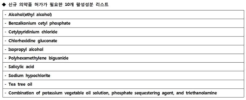 성분에 대한 안전성과 효과 분석을 취한 추가적 데이터 구축을 위해 3개 성분(Benzalkonium chloride · Benzethonium chloride · Chloroxylenol)에 대한 사용 가능 여부는 1년간 보류된다.