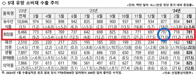 산업통상자원부(장관 안덕근· www.motie.go.kr )가 오늘(1일) 집계 발표한 ‘3월 수출입동향’ 자료에 따르면 3월 화장품 수출은 7억8천100만 달러로 지난해 같은 기간의 7억7천300만 달러보다 800만 달러·1.1%의 소폭 성장을 기록한 것으로 나타났다.