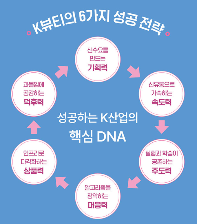 신간 'K-뷰티 트렌드'는 이 여섯 가지 힘을 한마디로 ‘트렌드 대응력’으로 요약하면서 모든 산업이 K-뷰티의 혁신 DNA를 배워야 한다고 강조한다. K-뷰티에서 K-산업의 성공 방정식을 찾을 수 있다는 말이다.