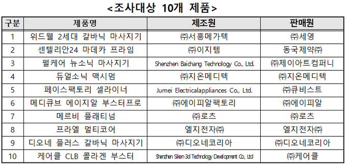 대상 제품은 △ 세영 ‘위드웰 2세대 갈바닉 마사지기’ △ 동국제약 ‘센텔리안24 마데카 프라임’ △ 제이아트컴퍼니 ‘펄케어 뉴소닉 마사지기’ △ 지온메디텍 ‘듀얼소닉 맥시멈’ △ 큐비스트 ‘페이스팩토리 셀라이너’ △ 에이피알 ‘메디큐브 에이지알 부스터프로’ △ 로츠 ‘메르비 플래티넘’ △ LG전자 ‘프라엘 멀티코어’ △ 디오네코리아 ‘디오네 플러스 갈바닉 마사지기’ △ 케어클 ‘케어클 CLB 콜라겐 부스터’ 등이다.