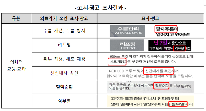 ‘의료기기법’(법률 제20888호)에 따르면 의료기기로 허가받지 않은 제품은 의료기기의 성능‧ 효능 및 효과에 관한 표시‧광고를 할 수 없다. 그러나 7개 제품이 주름 개선, 리프팅, 세포 재생 등 의료기기로 오인할 수 있는 효과를 표시‧광고한 것으로 밝혀졌다.