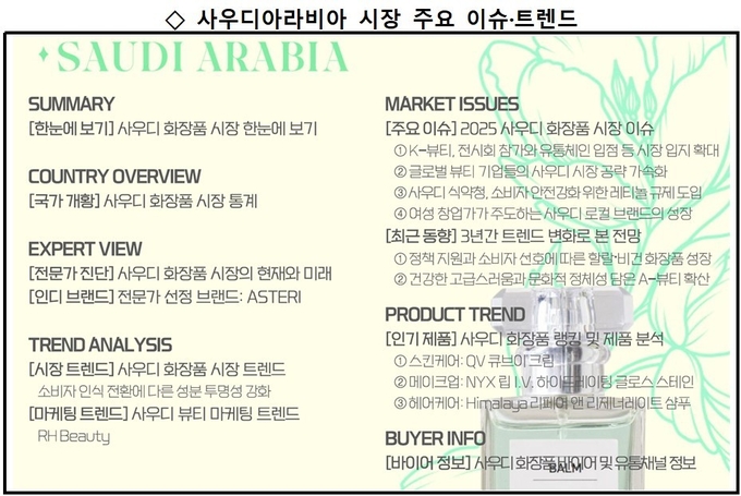 사우디아라비아에서는 △ 스킨케어 제품으로 큐브이(QV) 큐브이 크림(QV Cream) △ 메이크업 제품은 닉스(NYX) 립 I.V. 하이드레이팅 글로스 스테인(Lip I.V. Hydrating Gloss Stain) △ 헤어케어 제품으로는 히말라야(Himalaya) 리페어 앤 리제너레이트 샴푸(Repair&Regenerate Shampoo)의 인기 배경을 분석, 참고자료로서의 가치를 높였다. <정리·코스모닝 편집국>