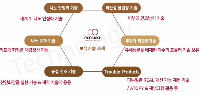 피코스텍은 ‘나이아신아마이드 16% 세럼’, ‘PHA 14% 앰플’ ‘콜라겐 크림 랩핑 마스크’ 등을 주력 제품으로 내세웠다. 이들 제품은 나노유화‧동결건조‧안정화 기술을 적용해 유효 성분 함유량을 높인 것이 특징이다.