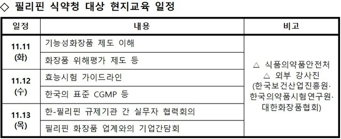 식약처는 관련해 지난 11일부터 오늘(13일)까지 필리핀 식약청(Food and Drug Administration) 화장품 담당 공무원 100여 명을 대상으로 필리핀 마닐라 현지에서 기능성화장품 제도 등을 포함한 대한민국 화장품 안전관리 제도에 대한 교육을 진행 중이다.