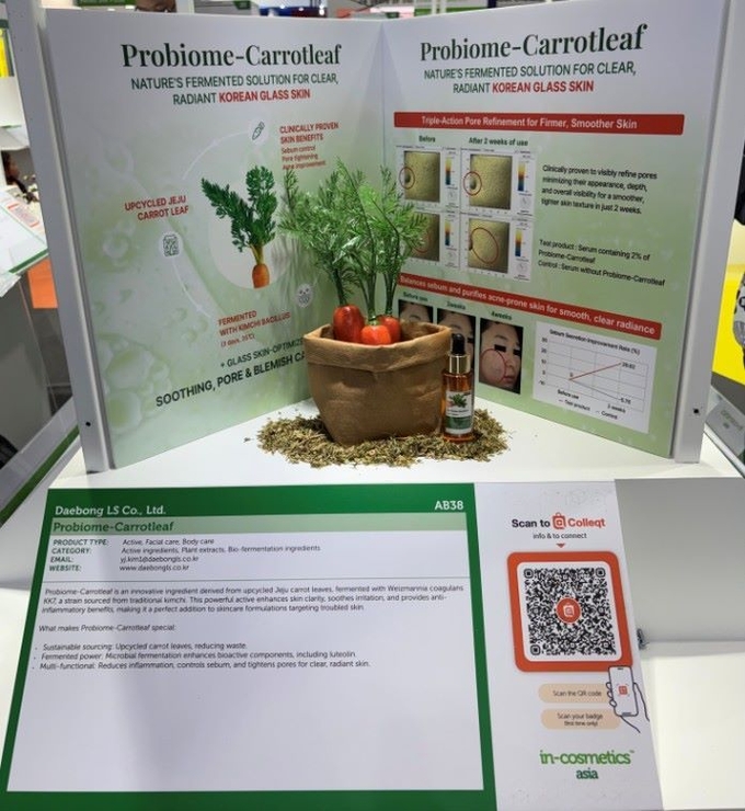K-뷰티의 대표 트렌드라고 할 유리 피부(Glass Skin) 콘셉트에 맞춰 ‘프로바이옴-캐럿리프’(Probiome-Carrotleaf)를 이노베이션 존에 전시했다. 제주산 당근잎을 업사이클링해 김치 유산균(Bacillus from Kimchi)으로 3일간 발효한 천연 유래 성분. 피지 조절·모공 개선·트러블 완화 등의 임상 효과를 확인했다.