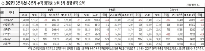 <2025년 3분기&1-3분기 누적 화장품 상위 6사 경영실적 요약: 아래 첨부문서 참조>