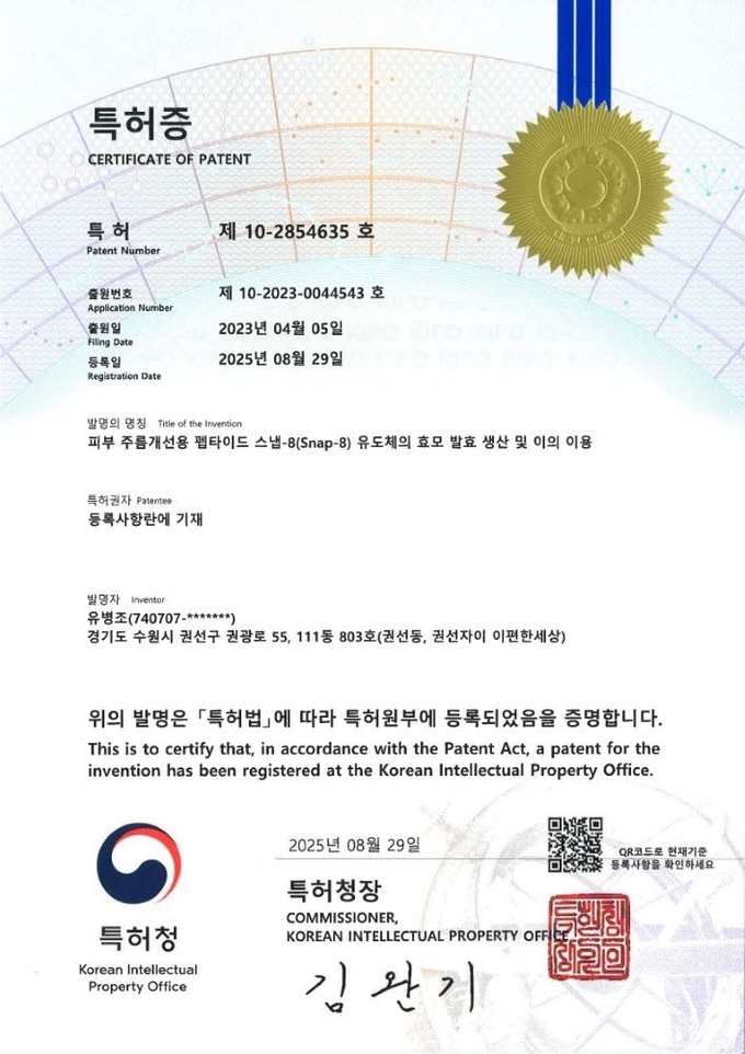 화장품 원료·소재 개발 전문기업 (주)비제이와이(대표 유병조)가 자체 개발한 차세대 펩타이드 원료 ‘BJY-PeptaLift-1™’의 피부 주름개선 효능·생산공정에 관한 특허(등록번호 10-2854635·피부 주름개선용 펩타이드 스냅-8 유도체의 효모 발효 생산과 이의 이용) 등록을 최근 완료했다.