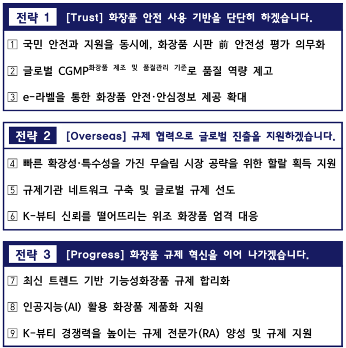 화장품 안전성 평가 제도를 도입하고, 소비자가 화장품 안전 정보를 쉽게 확인할 수 있도록 e-라벨 표시 제도를 도입한다. K-화장품의 안전 기반을 단단히 해 글로벌 시장에서 신뢰성을 제고한다.