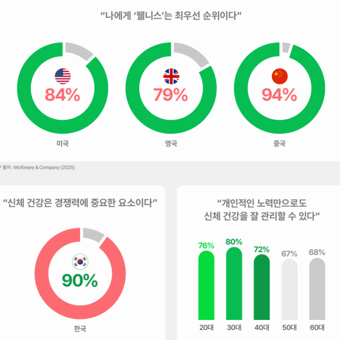 웰니스 트렌드는 한층 뚜렷하고 넓게 확산될 움직임이다. 미국‧영국‧중국 소비자들은 웰니스를 일상의 최우선 순위로 꼽았다. 웰니스는 K-뷰티처럼 글로벌 시장의 새로운 소비 트렌드로 부상한 모습이다.