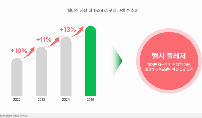 올리브영 구매 데이터에서도 웰니스 강세가 나타났다. 올리브영에서 웰니스 제품을 구매하는 15~24세 소비자 수는 2022년부터 두자릿수 증가율을 보였다. 20대 초반부터 건강을 챙기는 얼리 웰니스(Early Wellness) 경향이 짙어지면서다.
