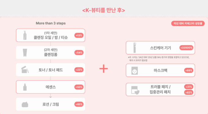 특히 K-뷰티의 수요가 얼굴 피부를 넘어 전신 관리로 확장하는 단계다. 기초‧색조‧퍼스널케어 관련 제품을 조합해 동시에 구매하는 소비자가 증가했다.