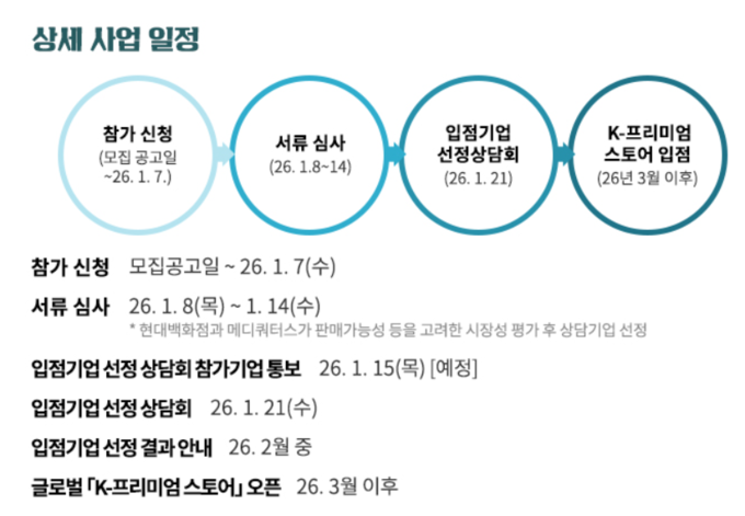 참가 희망기업은 한국무역협회 공식 홈페이지 내 ‘공지‧뉴스→공지사항→2026년 글로벌 K-프리미엄 스토어 입점 사업 참가기업 모집’에서 신청서류를 접수하면 된다.