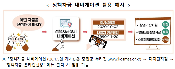 중기부는 기업이 정책자금을 간편하게 신청할 수 있도록 내비게이션을 도입한다. 기업이 업력·폐업여부·수출실적·자금용도 등 기초정보를 입력하면 내비게이터가 맞춤형 자금을 추천한다.