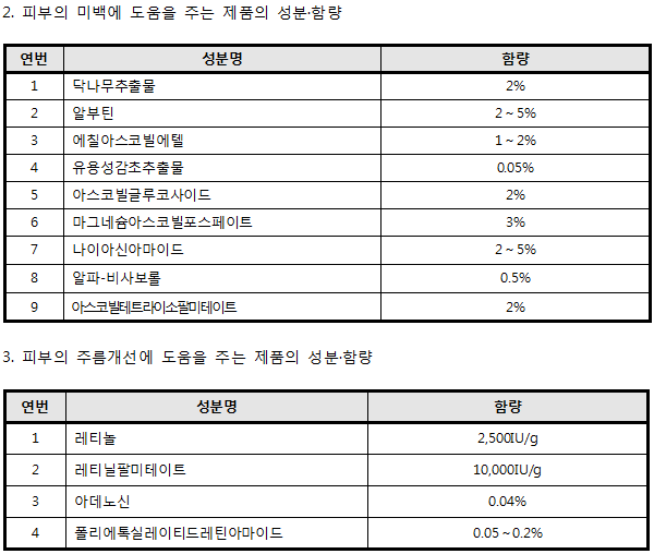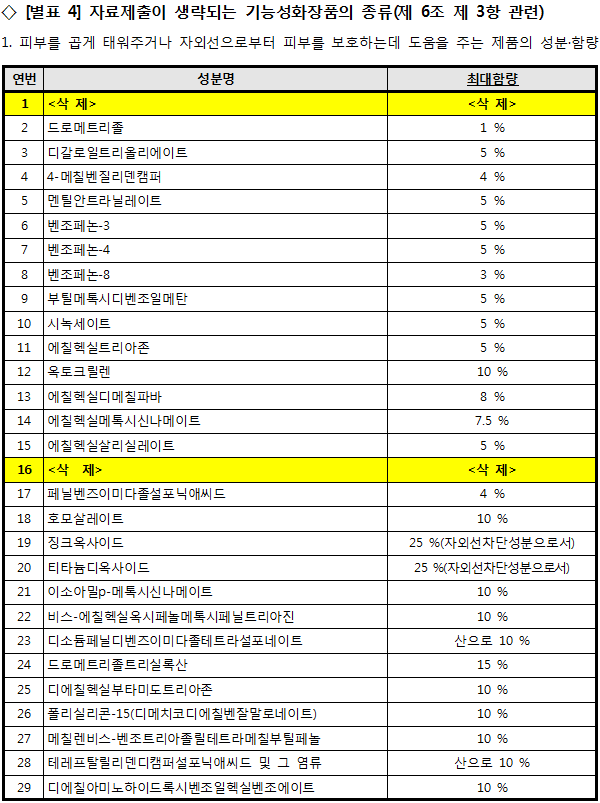 2. 기능성화장품 기준·시험방법 일부개정고시 https://www.cosmorning.com/mybbs/bbs.html?mode=view&bbs_code=LAW&cate=&page=&search=&keyword=&type=&bbs_no=217629 참조>