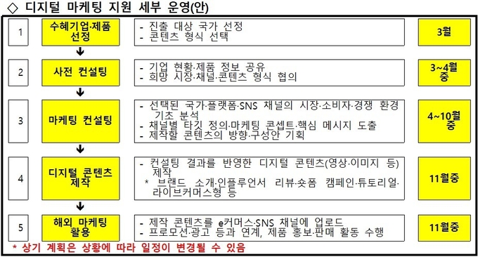 3월 중으로 수혜기업으로 선정을 마치고 희망 시장·채널·콘텐츠 형식 등에 대한 사전 컨설팅을 진행한다. 11월까지 △ 채널별 마케팅 콘셉트·핵심 메시지 △ 콘텐츠 기획·제작 · 활용 제안 등 디지털 마케팅에 대한 전반 과정을 지원받게 된다.