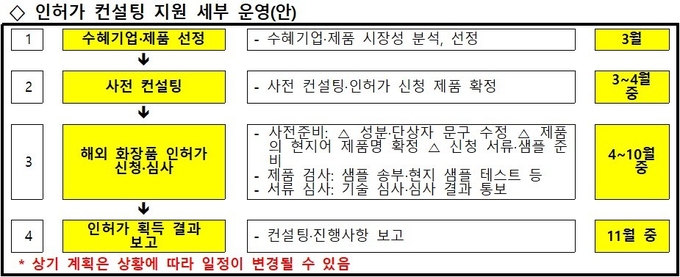2월 중 수혜기업 선정을 완료하면 기업 준비사항을 점검한 후 3월부터 관련 서류와 샘플 등 제반사항에 대한 컨설팅이 진행한다. 이후 11월까지 제품 검사·샘플 검사·서류 심사와 등록까지 마무리하는 절차를 거친다.