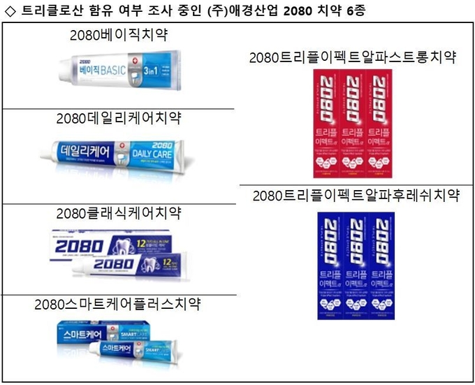 식품의약품안전처(오유경 처장· www.mfds.go.kr )는 공식 보도자료를 통해 “국내에서 치약에 사용이 금지된 트리클로산 성분이 함유된 것으로 알려진 애경산업(주) 2080 치약 수입제품 6종(△ 2080 베이직치약 △ 2080 데일리케어치약 △ 2080 클래식케어치약 △ 2080 트리플이펙트알파스트롱치약 △ 2080 트리플이펙트알파후레쉬치약 △ 2080스마트케어플러스치약)의 전 제조번호 제품에 대한 검사를 실시 중이며 해당제품을 만든 해외 제조소(중국 Domy社)에 대한 현지 실사도 진행 중”이라고 밝혔다.