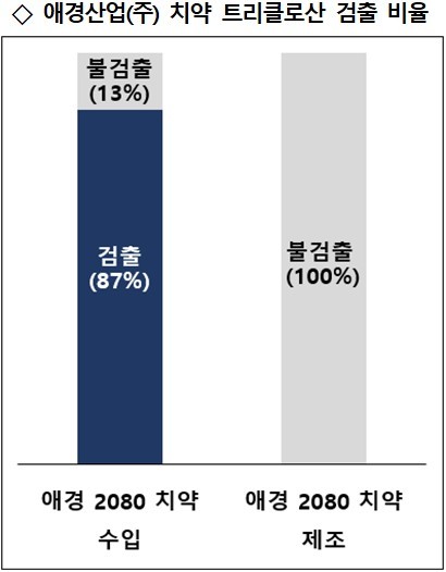 식약처는 “중국 Domy사에서 지난 2023년 2월부터 제조해 애경산업(주)이 국내에 들여온 2080 치약 수입 제품 6종 중에서 수거 가능한 870개 제조번호 제품과 애경산업)주)이 국내에서 제조한 2080 치약 128종을 수거해 검사했다”고 밝히고 “그 결과 수입 치약 6종·870개 제조번호 가운데 754개 제조번호에서 트리클로산이 최대 0.16%까지 검출됐다. 반면 애경산업(주)이 국내에서 제조한 128종 제품에서는 모두 트리클로산이 검출되지 않았다”고 덧붙였다.