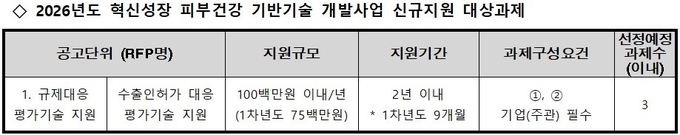 내년(2027년)에 종료 예정인 ‘혁신성장 피부건강 기반기술 개발사업’의 올해 신규과제는 ‘규제대응 평가기술 지원-수출인허가 대응 평가기술’에서 3건 이내로 선정할 전망이다.