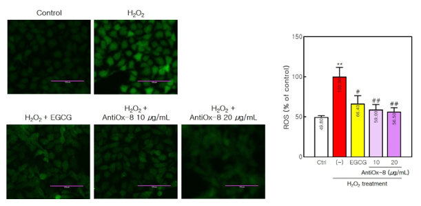 이번 연구에서 AntiOx-8이 활성산소종(ROS) 생성을 억제하고, 항산화 지표를 개선하는 점을 확인했다. AntiOx-8은 산화 스트레스 환경에서 세포 보호 효과를 나타냈다.