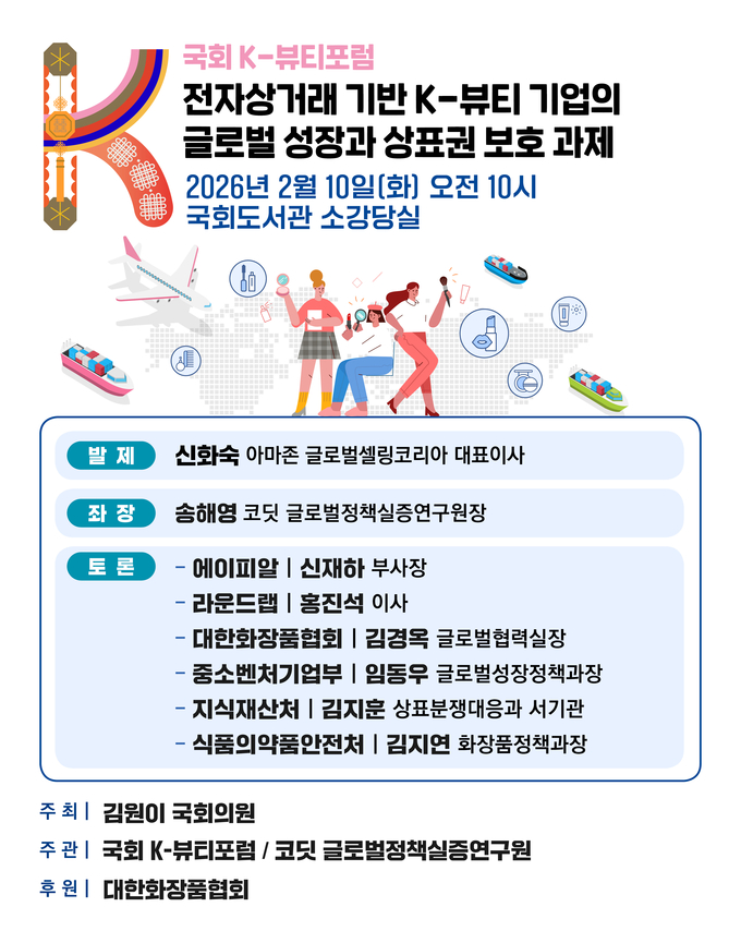 이 세미나는 김원이 더불어민주당 의원이 주최하고, 국회 K-뷰티 포럼과 코딧 글로벌정책실증연구원이 주관한다.
