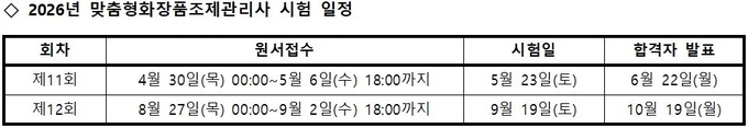 맞춤형화장품조제관리사(이하 조제관리사) 자격시험은 오는 5월 23일과 9월 19일, 두 차례에 걸쳐 실시한다.
