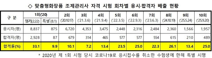 지난 2020년부터 실시한 모두 열 한 차례(2020년 특별 시험 포함)에 걸친 맞춤형화장품 조제관리사 자격시험을 통해 조제관리사 7천495명을 배출했다. 11회 동안의 응시자 수는 3만7천391명으로 평균 합격률은 20.0%로 나타났다.