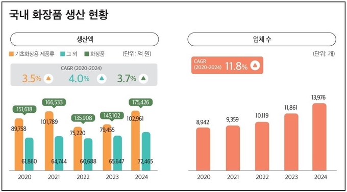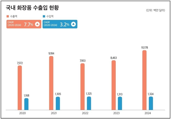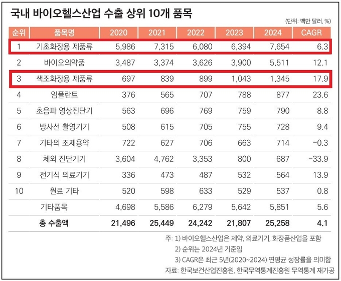 기초화장용 제품류의 경우 지난 2020년부터 2024년까지 5년간 연평균 6.3%의 증가율과 함께 2024년 수출 실적이 76억5천400만 달러를 기록, 바이오헬스산업 수출 품목 가운데 최대 실적을 올렸다.