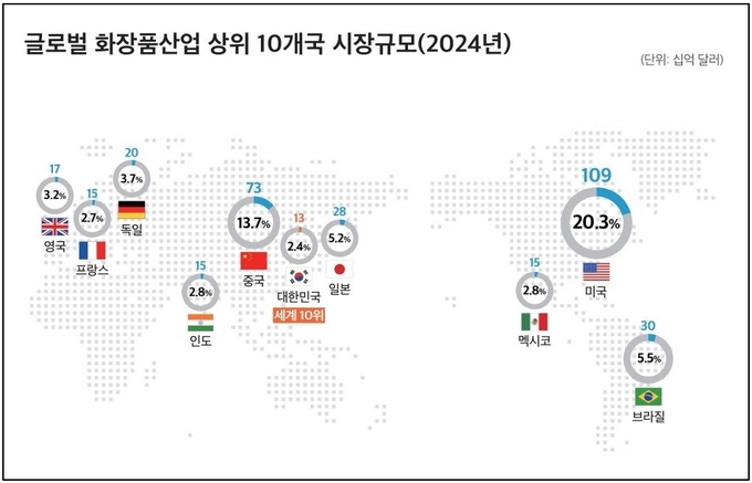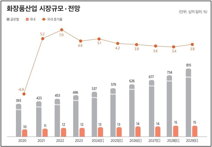 통계집에 따르면 오는 2029년 글로벌 화장품 시장 규모는 8천150억 달러(한화 약 1천200조8천536억 원)까지 성장할 것으로 전망했으며 대한민국의 경우 150억 달러(한화 약 22조1천16억 원) 수준을 기록할 것으로 예상했다.