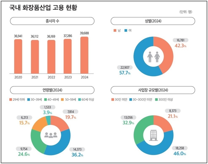 2024년 말 기준 국내 화장품 산업 종사자 수는 모두 3만9천688명으로 집계됐으며 이 가운데 여성이 57.7%(2만2천907명)를 차지하고 있었다.