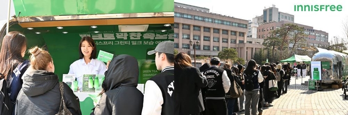 이니스프리가 개강 시즌을 맞아 서울 소재 대학 캠퍼스 세 곳에서 ‘그린티 밀크 보습 에센스’ 무빙팝업을 진행, 새 고객 창출과 접점 확대를 위한 활동을 펼쳤다.