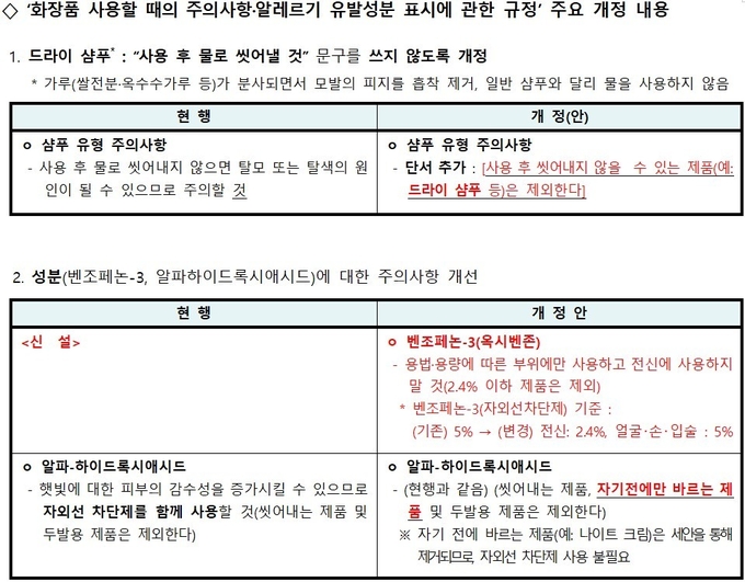 즉 드라이샴푸와 같이 사용 후 바로 씻어내지 않아도 되는 샴푸는 ‘사용 후 물로 씻어내지 않으면 탈모 또는 탈색의 원인이 될 수 있으므로 주의할 것’이라는 주의사항을 제품 특성에 맞게 기재하지 않아도 되도록 예외사항을 새롭게 추가했다.
