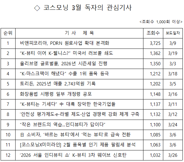 1위 기사는 ‘비앤피코리아, PDRN 원료사업 확대 본격화’다. PDRN이 화장품 원료로 각광받으면서 3월 한달 동안 높은 조회수를 기록했다. 비앤피코리아는 10여년 동안 화장품·제약·의료기기 업계에 PDRN(연어 DNA) 원료를 공급해왔다. 올해부터 중국 D&S 바이오테크놀로지와 독점 계약을 맺고 고품질 PDRN을 제공할 계획이다. 이 회사는 뷰티업계에 △ 연어 DNA(PDRN·PN) △ 히알루론산 △ 콜라겐 △ PLA △ 베타글루칸 등을 유통하고 있다.