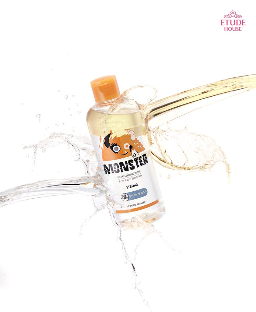 에뛰드하우스의 몬스터 오일 인 클렌징 워터는 오일의 강력한 세정력과 워터의 산뜻함이 만나 듀얼 클렌징 효과로 강렬한 스모키 메이크업까지 손쉽게 지워내는 클렌징 워터 제품이다. 듀얼 클렌징 효과란 오일이 메이크업을 빠르게 녹이고 워터가 메이크업 노폐물을 닦아내는 이중 클렌징 효과로 정확하게 노폐물을 닦아 내어 오래 문지르지 않아도 깨끗한 피부를 선사한다.