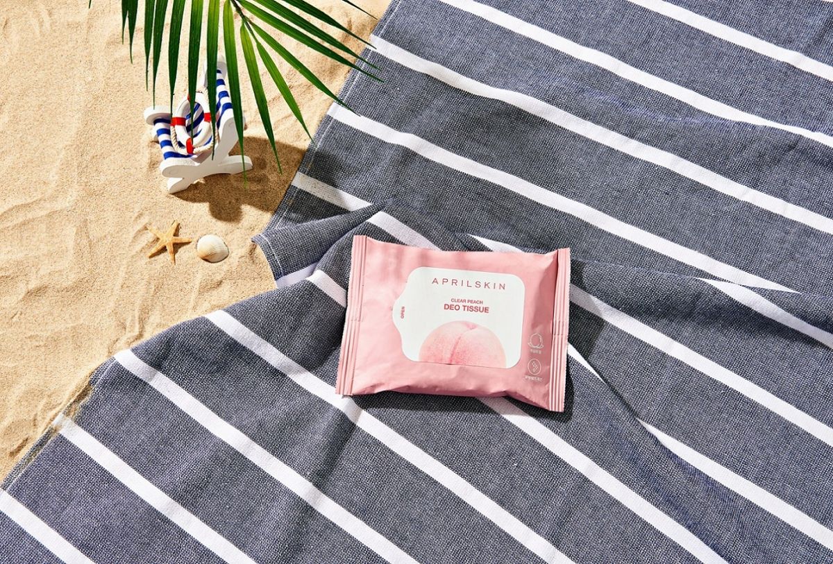 에이프릴스킨의 신제품 클리어 피치 데오 티슈는 간편하게 뽑아 쓰는 티슈 타입의 데오드란트로 땀과 유분기로 끈적이거나 냄새가 나는 등 불쾌감이 느껴지는 부위를 산뜻하게 케어해준다. 피부의 노폐물을 깨끗하게 닦아내고 보송보송한 마무리감을 부여하는 동시에, 멘톨 성분이 즉각적인 쿨링감을 선사하는 것이 특징이다.