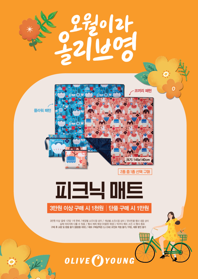 올리브영은 황금연휴를 앞두고 18일부터 3만원 이상 고객에게 1만원 상당의 휴대용 피크닉 매트를 1천원에 판매하는 행사를 연다.