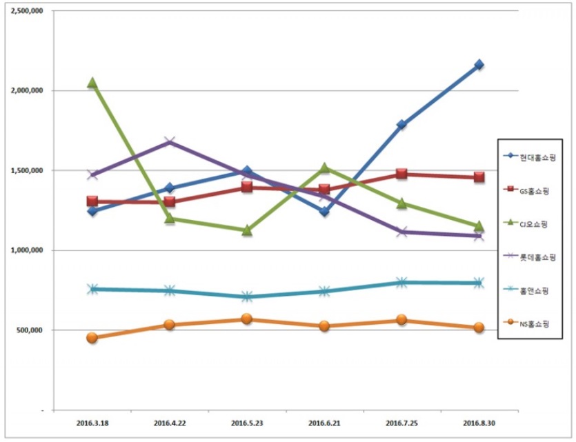8월 TV홈쇼핑 브랜드 평판조사 결과, 현대홈쇼핑·GS홈쇼핑·CJ오쇼핑·롯데홈쇼핑·홈앤쇼핑·NS홈쇼핑 순으로 나타났다.