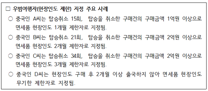관세청은 △ 탑승권 취소 횟수 △ 구매횟수 △ 구매금액 등을 바탕으로 현장인도 제한 기간에 차등을 둔다. 1개월 제한은 549명, 2개월 제한은 314명이다. 3개월 제한은 74명, 6개월 제한 23명, 무기한 제한은 42명인 것으로 나왔다.