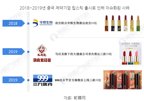 2018년 하반기 화시(华熙)바이오회사는 구중궁궐 이미지를 연상시키는 고궁 시리즈 립스틱을 발매해 화제를 모았다. 지난 해 제약그룹 마잉롱(马应龙)도 립스틱 세가지를 들고 나왔다. 화룬산지우(华润三九)도 온라인 브랜드숍에서 립스틱을 증정품 형식으로 출시했다.