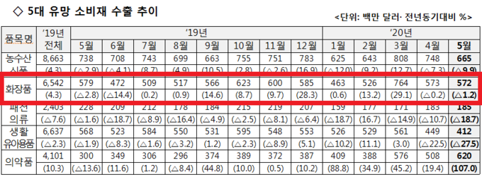 지난 5월 화장품 수출실적은 5억7천200만 달러로 잠정 집계됐다. 전년 같은 기간의 5억7천900만 달러, 1.2% 감소한 수치다. 또 지난달 5억7천300만 달러보다는 100만 달러가 줄었다.