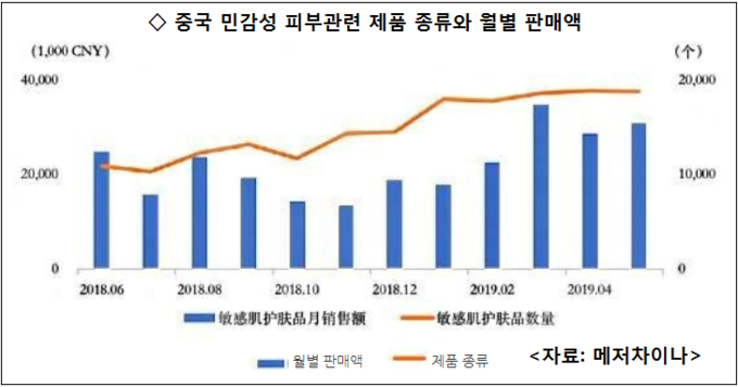 민감성 피부 제품군을 △ 클렌징 △ 기초화장품 △ 마스크팩 △ 페이스 메이크업 △ 색조화장품 △ 남성 화장품 등으로 나눠 각각의 판매액을 비교 분석한 메저차이나 자료에 따르면 기초 화장품(토너·에센스·로션·아이크림·스킨케어 세트)의 판매액이 다른 제품군에 비해 현저히 높았다. 클렌징 제품과 마스크팩 등에도 민감성 피부 소비자들의 관심이 높은 것으로 나타났으며 이러한 추세는 향후 몇 년 간 지속될 것으로 예상된다.