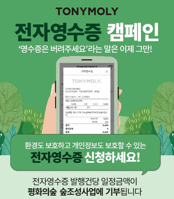 토니모리(대표 배해동)가 전자영수증 제도를 도입했다. 전자영수증 발행 건당 50원씩 적립해 숲을 보호하는 캠페인도 펼친다.