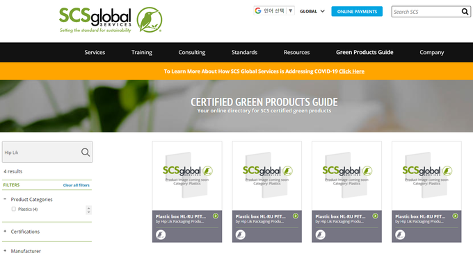 한편 힙릭패키징의 RPET 재료는 SCS 글로벌 서비스의 인증을 받았으며 SCS글로벌 서비스 녹색제품 가이드에도 등재돼 있다.
