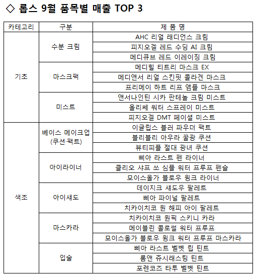 롭스 9월 전체 매출 1위부터 10위는 순서별로 △ 고려은단 비타민C 1000 △ 락토핏 생유산균 골드 △ 바이오더마 센시비오 H20 △ CK one △ 우르오스 올인원 스킨 밀크 △ 페라리 라이트 에센스 △ 보코통 코스메토 원형 화장솜 △ AHC 리얼 래디언스 크림 △ 메디큐브 제로모공패드 △ 경남제약 결콜라겐 뷰티바이오틱스 등이다.
